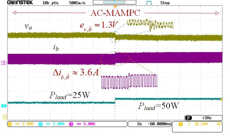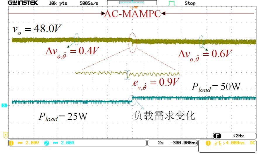 团队提出了自适应约束模型主动失配预测控制策略(AC-MAMPC),如图4所示。该方法通过主动改变功率环及电流环参数,降低电流纹波,并结合自适应约束机制减少稳态误差。实验结果如图5所示,电流纹波降低16.7%,母线电压动态误差减少62.5%,显著提升了电能质量和系统稳定性。
