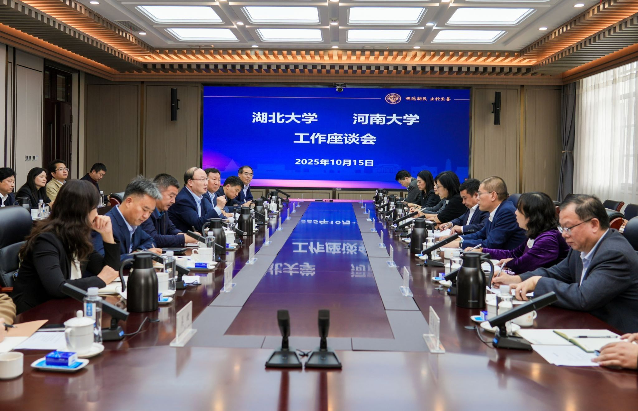 张锁江代表学校对刘建平校长一行的到来表示欢迎,并围绕学校的办学历史、发展现状与未来规划作了系统介绍。他指出,学校按照“研究型综合性国际化一流大学”办学新定位,全面推进“强理振文、新工新医”的办学新主线,推动河大进入了转型跨越、战略跃迁的发展新阶段。他强调,观念的转变是发展的关键,并分享了学校在研究型大学建设、人才培养结构优化、以及面对人工智能时代教育教学模式变革等方面的思考与实践。他指出,湖北大学作为一所底蕴深厚、特色鲜明的地方重点综合性大学,在多个学科领域取得了显著成就,其办学经验值得河大学习借鉴。他希望两校以此次交流为起点,从四个方面开展深度、务实的合作:一是加强互访交流,建立常态化沟通机制,推动学院结对联系、互相学习;二是共同举办高水平学术会议,搭建合作平台,扩大双方学术影响力;三是联合策划并申报重大科研项目,以项目为载体,共同产出成果、培养人才;四是推动人才与文化领域的相互支持,增进双方情感认同与战略互信。